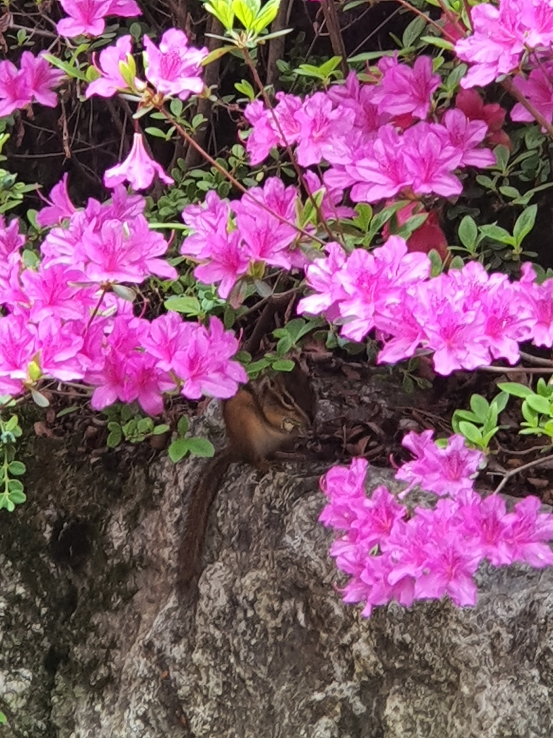 캠핑장에 들어서면 공기부터 남다르다, 맑은 숲 속의 공기, 아래쪽보다 차가운 공기, 늦게 핀 철쭉, 꽃향기 등