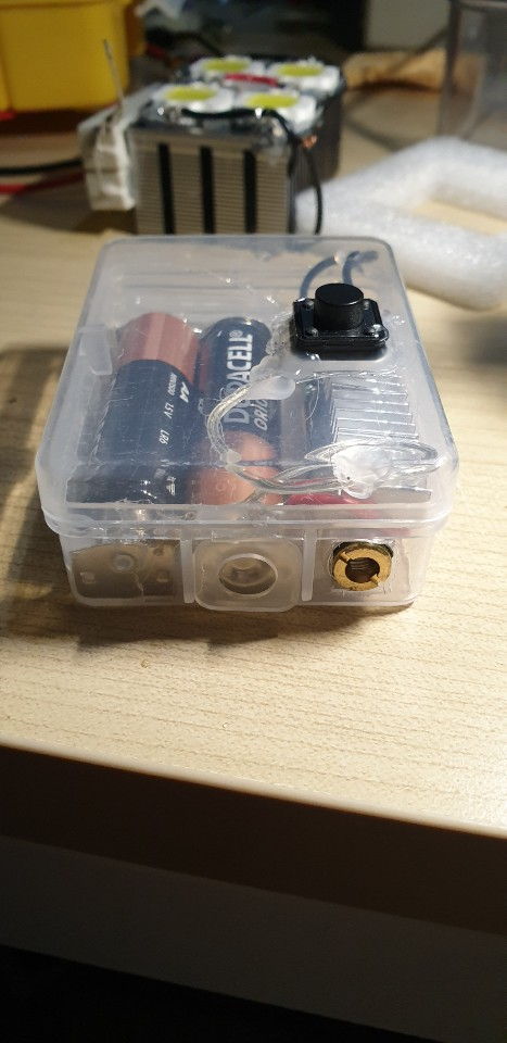 글루건으로 건전지 접점, 그리고 레이저 모듈을 고정해주고 케이스 뚜껑에 스위치를 달아주고 납땜후 마무리 했다.