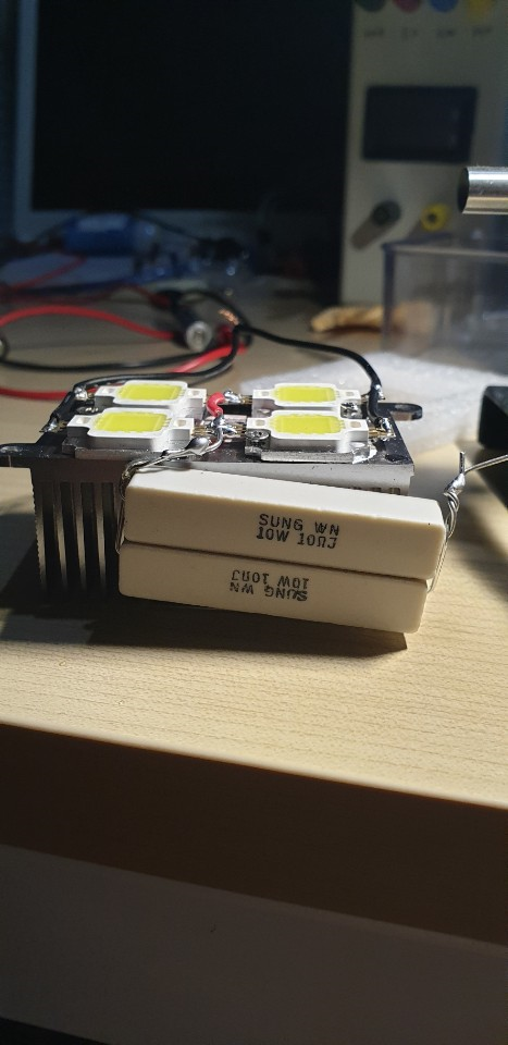 저항 없이 12v 전원에 다이렉트로 물릴 경우 굉장히 밝으나 발열이 너무 심해 10초만 켜놓으면 칩이 녹아 내일것 같았다.