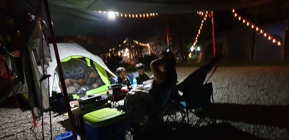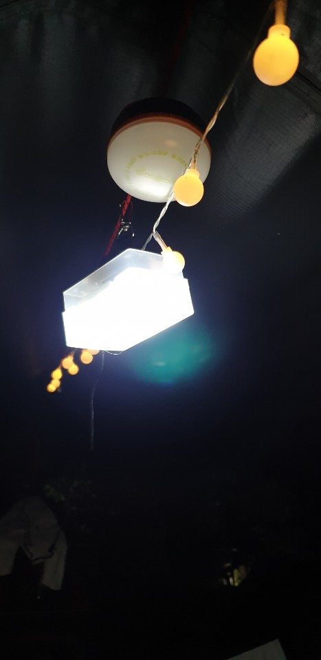 조명을 따로 준비할 필요가 있을까 싶어 집에 있던 작업등과, 침대용 조명등 하나, 그리고 줄 조명 하나 챙겨간 게 다였는데 타프도 문제였지만 조명도 문제였다.