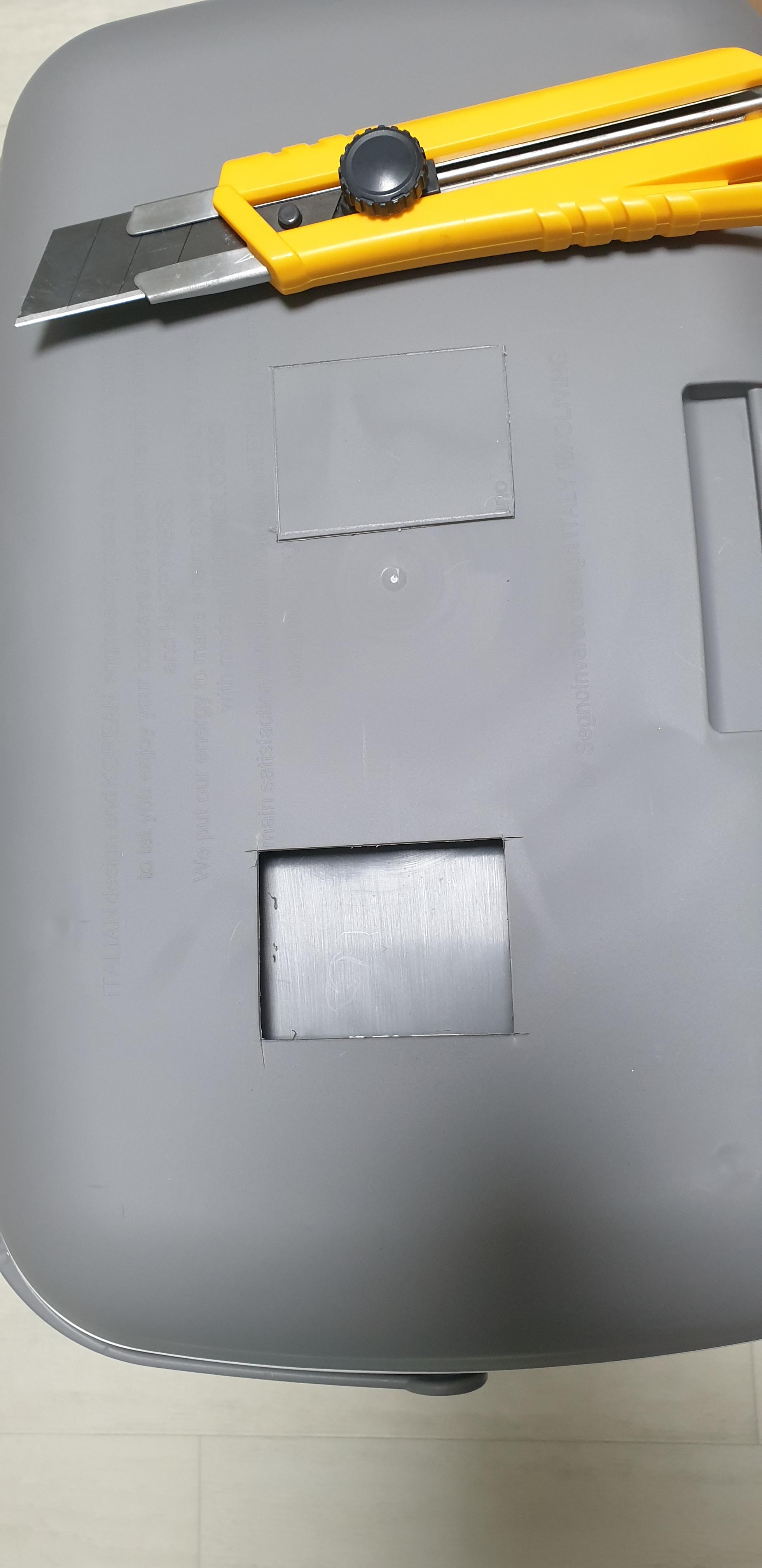 구멍 사이즈를 재고 케이블이 나올 공간과 냉각부 옆면을 차단할 공간을 고려해 여유있게 절단한 후 모듈만 집어넣은 상태이다.