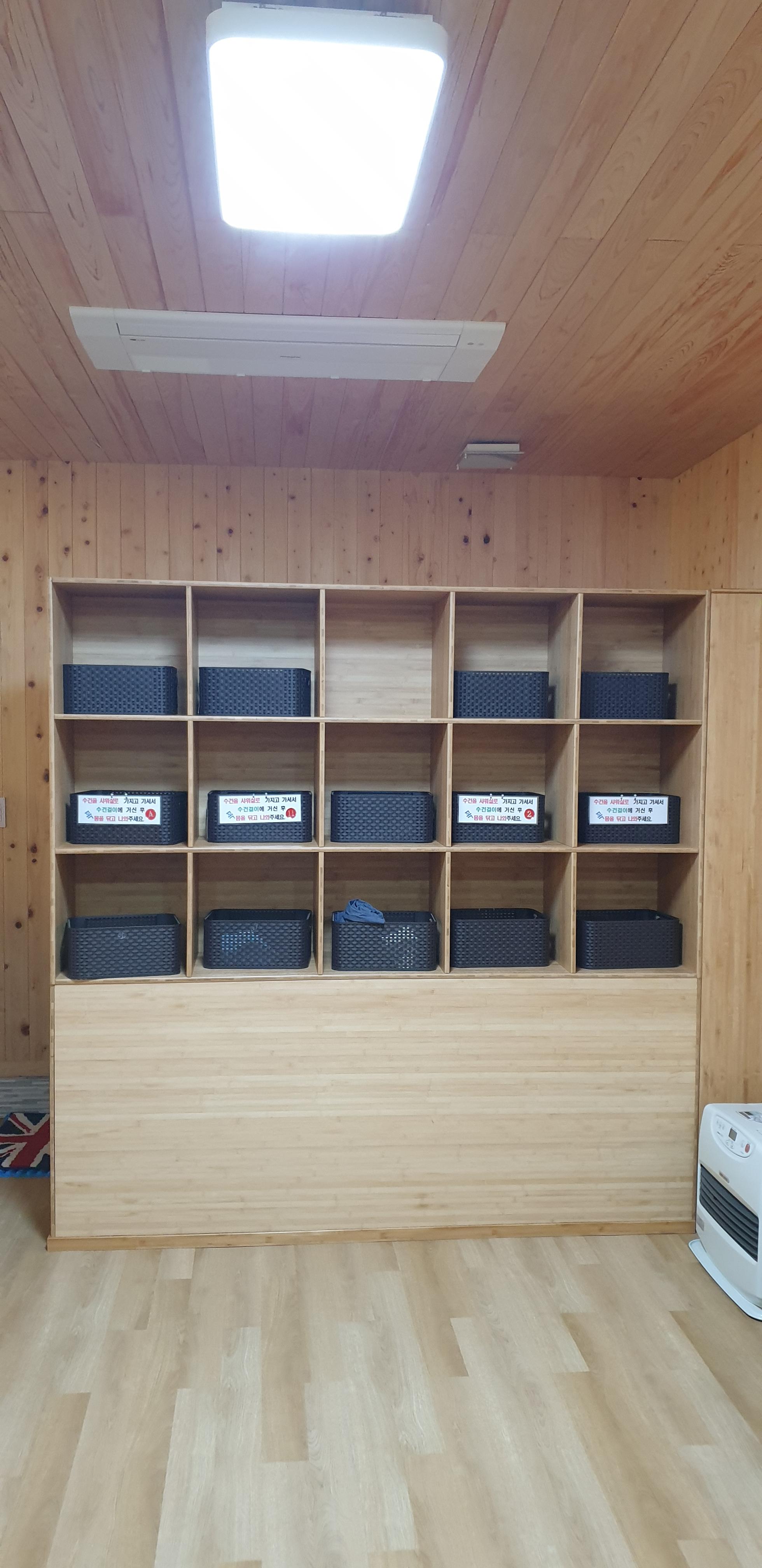 한칸씩 사용할 수 있는 냉장고가 있으며, 이날 외부 개수대 보수공사와 냉장고가 있는곳 에어컨을 설치하는 공사가 있었다.