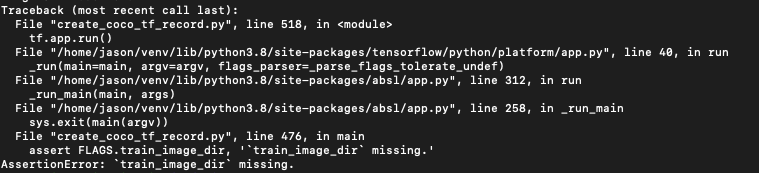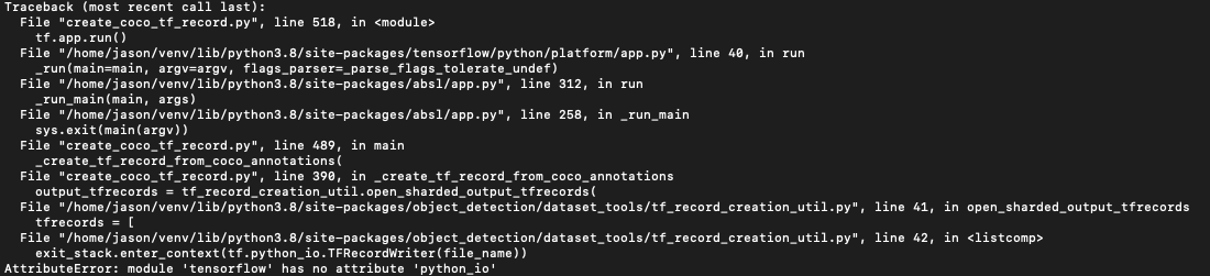 Jason park@ 2021. 9. 17. 10:26labeling 이미지를 이용해 TFRecord 로 변환하려고 tesorflow git 에서 다음 파일을 받고 실행하는데 에러가 발생한다.