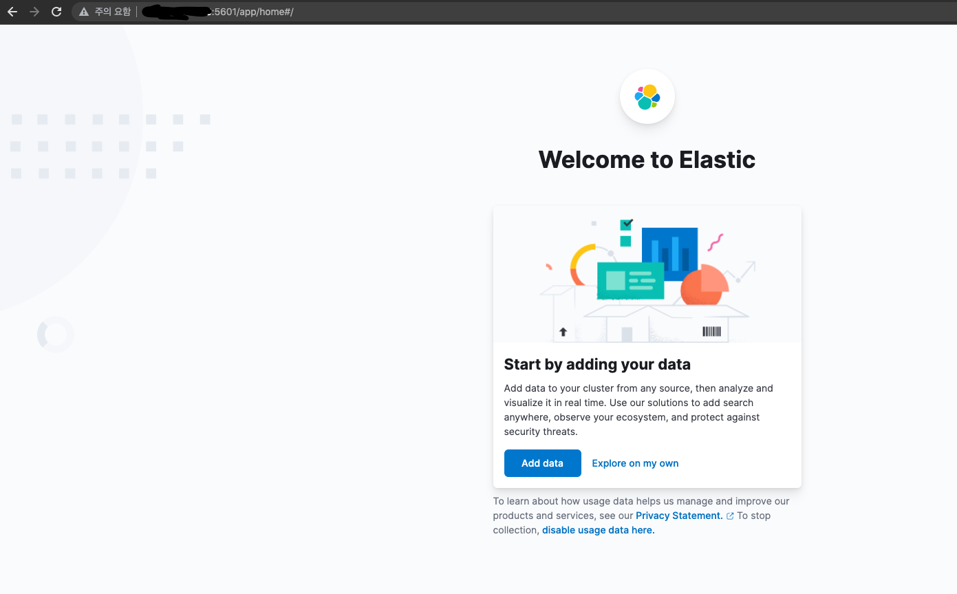 브라우저에서 http://IP주소:5601 주소를 통해 접속을 시도하면 아래와 같은 화면을 볼수있다.