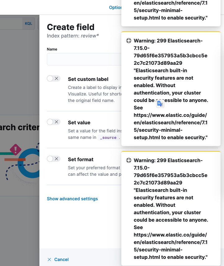 엘라스틱, 키바나만 설치하고 키바나를 사용하다보면 경고창이 자주 뜬다.