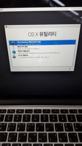 아무래도 기존 OS에서 설정과 문서파일과 어플리케이션만 나눠서 복원해서인가 싶어서 맥 시동디스크를 통해 타임머신 메뉴로 복원을 시도해 보기로 했다.