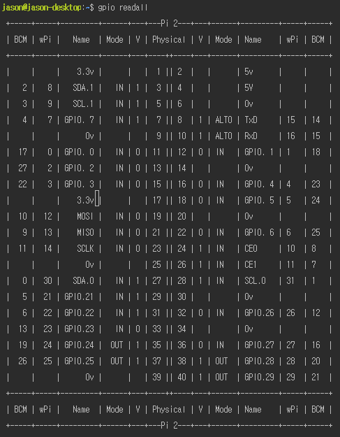 쉘에서 gpio readall 을 이용해 핀번호를 확인할수도 있다. (위의 그림과 동일하게 배치되어있다)